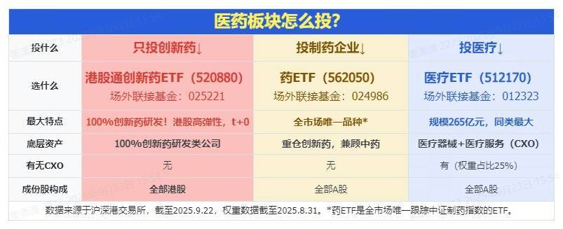 注:根据沪深交易所数据,截至2025.9.22,医疗ETF规模265亿元,在全市场医药类ETF中规模最大(1/50)。药ETF是全市场首只也是目前唯一跟踪中证制药指数的ETF。